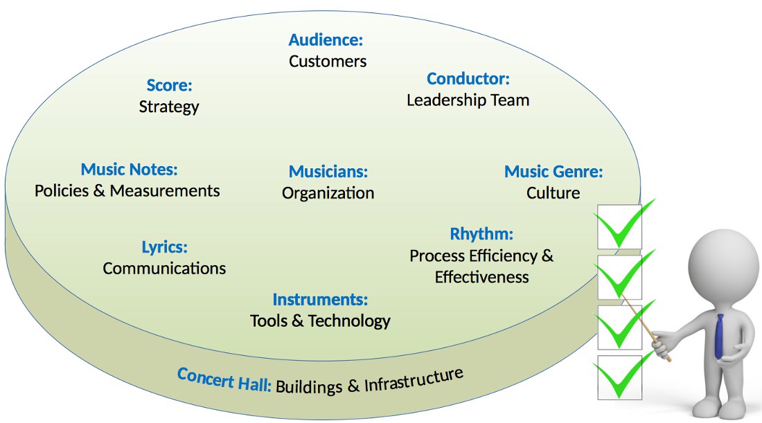 We use the Orchestra Model© as an operational assessment tool for explaining the importance of matching a business’s capabilities to its strategic goals. This has proven to be very effective in helping clients visualize the significance of organizational cohesion, and the potential consequences when organizational resources do not perform in harmony.